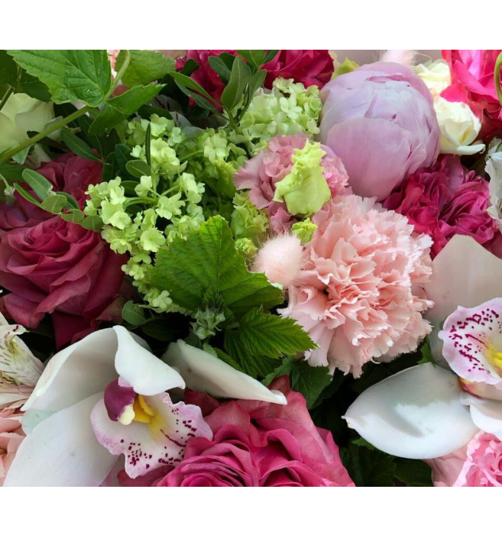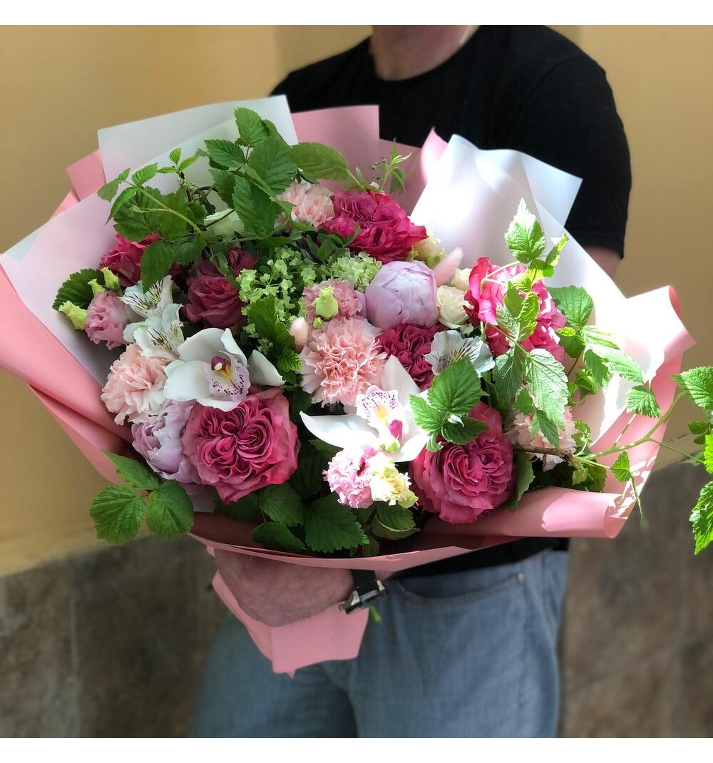 Яркий букет с пионами, пионовидными розами, создаст атмосферу яркого и вкусного лета и напомнит о скором отпуске